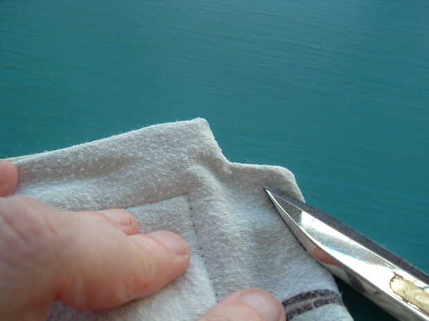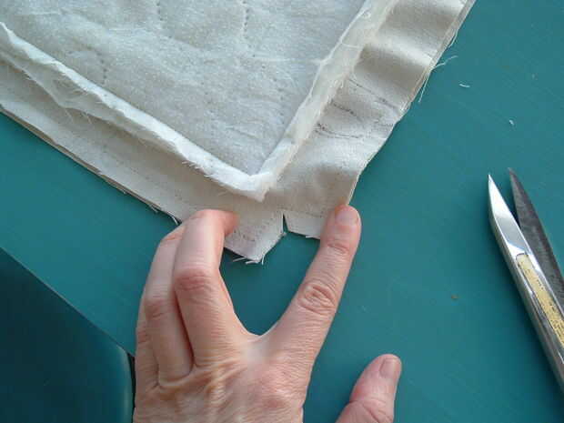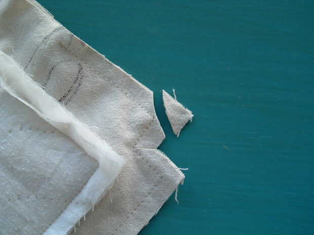 Cortar con cuidado en las esquinas hacia adentro, dejando un milímetro o dos (1/16 pulgadas) para la costura (ver foto).