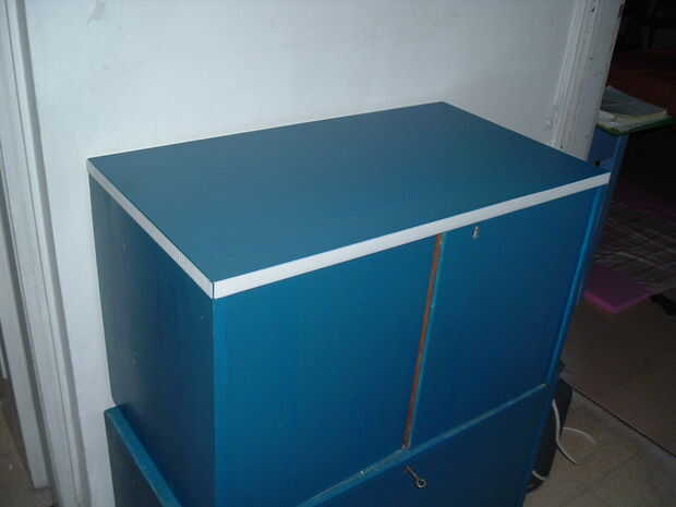 Esto podría no ser necesario, pero pensé que sería más fácil de administrar en piezas más pequeñas, así que corté la cinta Velcro gancho en cuatro piezas - dos tiras del tamaño de la anchura del gabinete superior y dos tiras del tamaño de la profundidad superior de gabinete (si como yo, tiene un Velcro para coser la tira, colocar cinta de doble cara en la parte posterior de las tiras). Coloque las tiras a los lados superiores del gabinete. Y ahora que ya está todo listo-