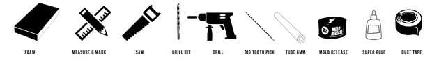los tablones sobrantes - vieron - diente grande de pegamento - cinta aislante - espuma bloque - tubo de 6mm - elegir la broca de 3mm - Lápiz - - Taladro broca de 3mm - broca de 6mm - regla