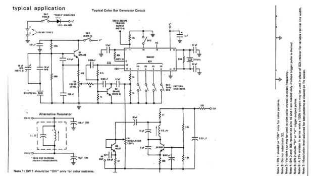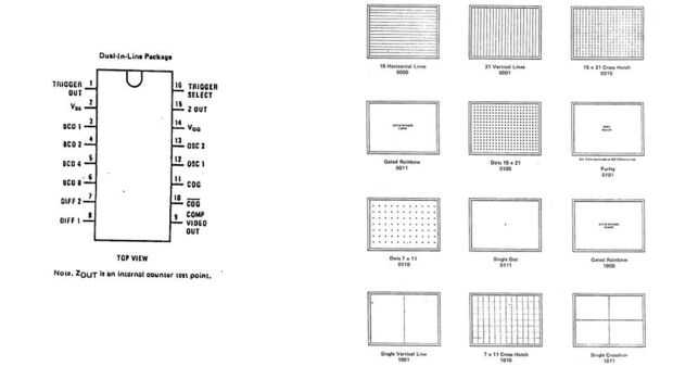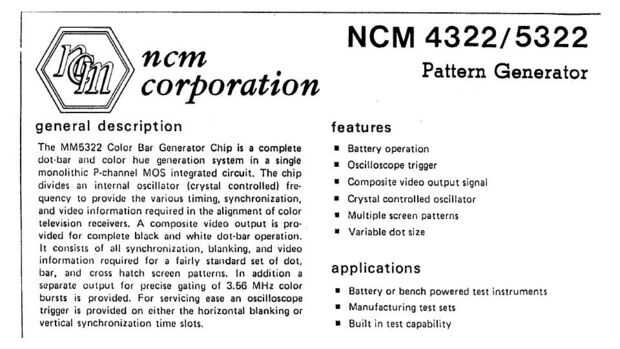 El corazón del generador de patrón de Hickok fue por supuesto un generador IC. La web proporciona las hojas de datos para el generador NM5322 IC. Esto era sorprendentemente fácil de usar. Cuatro cambiar configuración (encendido o apagado) proporcionada 12 diferentes patrones de video. Intrigante.