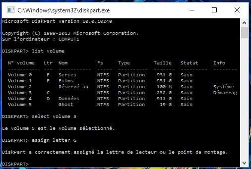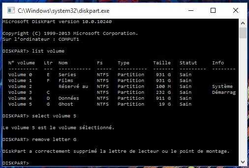 "select volume X" (donde X es el número del volumen que desea ocultar. En mi caso 5) retorno del golpe