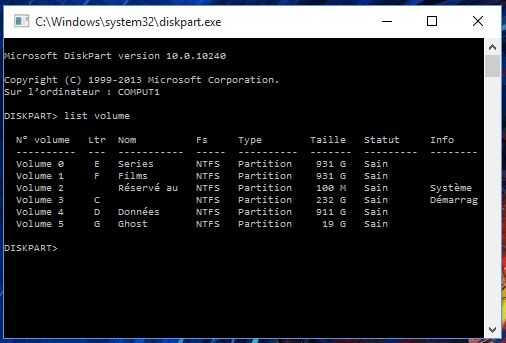 -en esta nueva ventana, escriba "lista de volumen" y presiona enter. Aparecerá la lista de todas las unidades/particiones. Aquí se debe anotar el número y el nombre de la partición que desea ocultar. En mi caso, elijo el quinto volumen con la letra G. tenga cuidado, usted no será capaz de ocultar la partición fueron está instalado su sistema operativo.