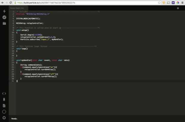 Haremos todo esto a través de Particle.io de WEB fantástico basado en IDE para escribir y el código en el módulo. Vaya a build.particle.io/build para empezar.