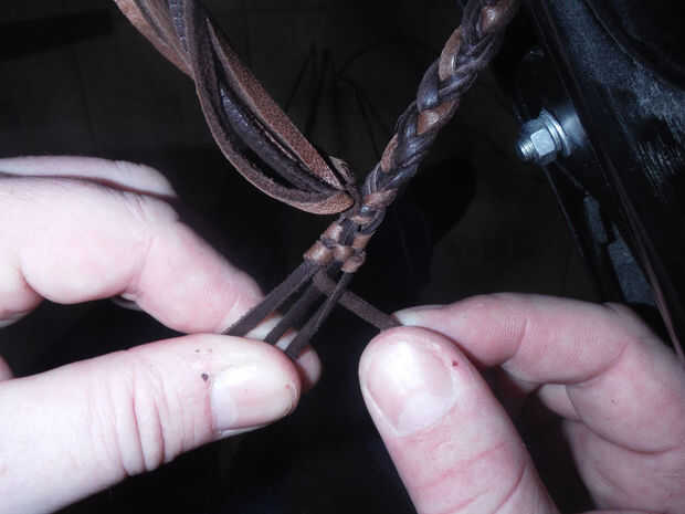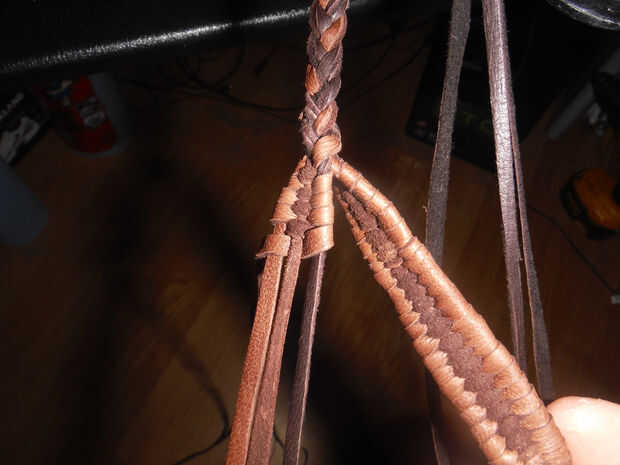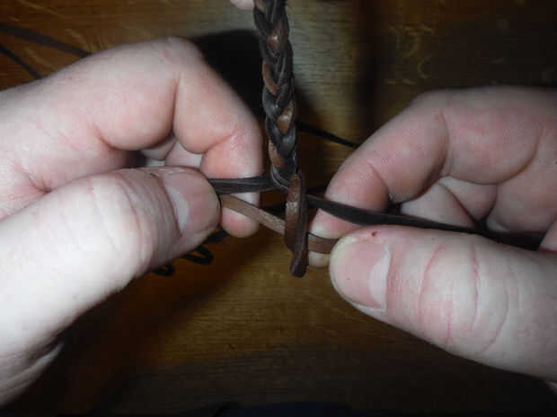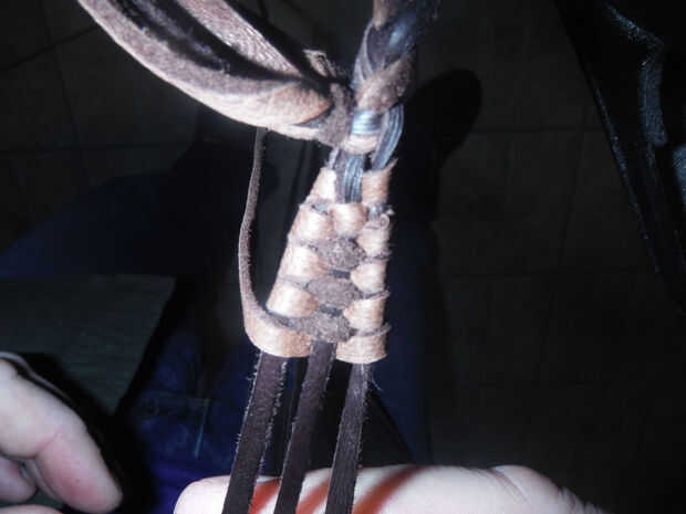 Con hebras de 3 + 1 de la otra mitad de la bolsa de split atado apagado y colocado fuera del camino, coge los tres hilos que va a trabajar con y mantenerlas perpendiculares entre sí. Ahora toma tu cuarto filamento y comenzar a tejer en un más bajo patrón, bien en el primero y después un poco más hasta que comienza a hacer un parche que es aproximadamente 3/4-1" de ancho. El proceso es sencillo, comenzar de nuevo la izquierda, debajo de la media, sobre la derecha y alrededor por debajo, ahora sobre el centro y debajo de la izquierda que viene otra vez. Repita este proceso hasta que tengas una pieza tejida que es aproximadamente tan larga como el ancho de los 4 dedos. ** Como te acercas al final, apriete su armadura para que cree un cono mucho como él en la partida end.* * cortar cualquier longitud adicional de la cadena de bolsa dejando aproximadamente 6 pulgadas y amarra para que no desentrañar.