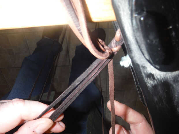 Para crear la bolsa, tenemos que añadir la cuarta cadena que creamos al principio, con un extremo utilizado a un lado de forma de la fractura y el otro para el lado opuesto. Por desgracia, no documentarlo, pero la mejor manera de incorporarlo sería añadir a la rama principal para 1 o 2 más trenzas, asegurar, después de que el hecho que un extremo se convierte en parte de las izquierda tres líneas, y el otro extremo se incorpora a la derecha tres filamentos. En mi video, yo uso una aguja de coser para coser a través de la rama principal, que es otra forma que esto se puede lograr.