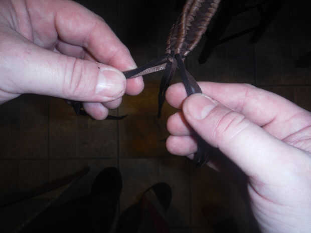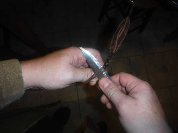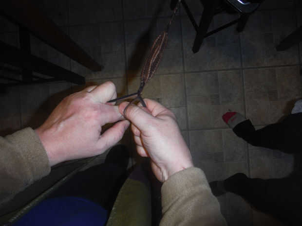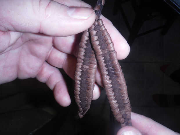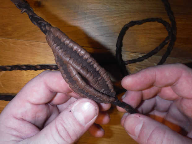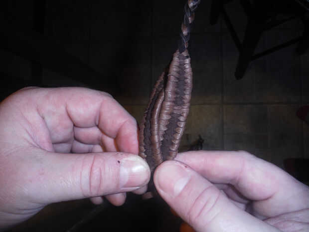Una vez que dos piezas de tejido para su bolsa, usted necesitará reunir el extremo opuesto antes de comenzar en su extremidad secundaria. Usted notará que una pieza automáticamente quiere superponer la otra. Lo que queremos es invertir para el lado de la rama secundaria (imagen 2 y 3). La razón de esto es que, cuando se está utilizando, las piezas invertidas hará que la bolsa en forma de tazón, sosteniendo la piedra en su lugar más segura. Si no doblarlo sobre, usted encontrará que la bolsa sólo aplana hacia fuera y no mantiene su munición.