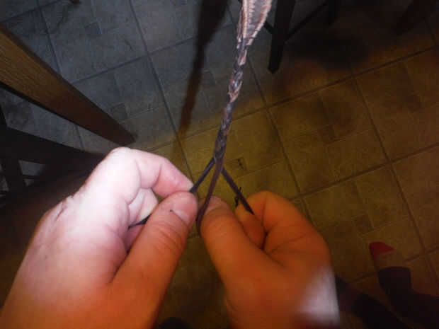 Una vez que ha establecido la bolsa, debe separar los seis filamentos en tres grupos de dos otra vez. Ahora te darás cuenta todavía tiene la longitud adicional de la armadura de bolsa sobrante. Añadir una cadena a la izquierda más paquete, y uno del filamento a la derecha la mayoría del paquete y comenzar a tejer como lo hizo cuando inició la rama principal. Una vez hayas completado 3-4 trenzas, puede cortar la longitud adicional (imagen 7) de los filamentos de tejido de bolsa y les terminar allí. La tensión en la trenza se aseguran en su lugar y evitar que la bolsa de desenvolver.