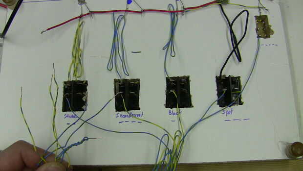 Paso 3: Usando la "función de continuidad" (hace un sonido cuando las cosas hacen una conexión) en su búsqueda multímetro que cable corresponde a qué. Comience en el extremo del panel de control y uso de guiones, marca todo, cómo lo desea. Para mí: estroboscópico es 2 Chorritos CFL es 4 guiones, negro es 1 chorrito, punto 3 guiones, es poder principal es 5 guiones. Hacer estos guiones en el alambre con la continuidad con un rotulador de punta fina.