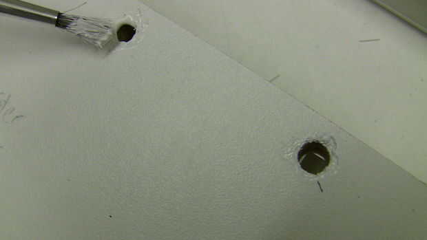 Paso 1: Empezar por la pintura en los agujeros con pintura blanca. Las virutas de la madera también luego pueden ser pintadas.