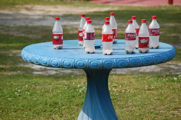 Recoger varios vacíos 20 oz botellas. Poner un poco arena en cada uno de peso. Puesto para arriba en una hilera espaciada un poco.