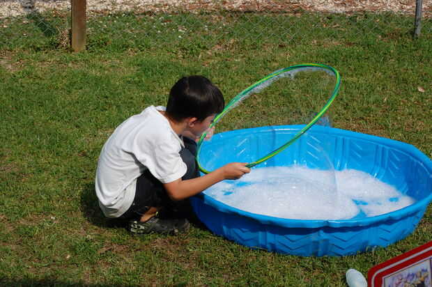 Verter solución de burbujas en una pequeña piscina de plástico,