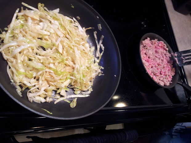 Ingredientes: cabeza de repollo (que usará alrededor de la mitad), aceite de sésamo, queso crema (8oz), ajo picado, cangrejo (imitación o reales, que ajusta a su presupuesto mejor), tierra de cerdo, cebolla verde, pimienta blanca (no necesita mucho)