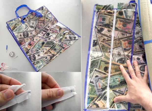 Con la medida correcta de la cremallera de longitud corte y doblado encima, cada elemento de cremallera fue sen en cada borde de corte largo acaba de hacer. Si se hace correctamente te bolsa debe buscar el mismo como cuando lo compró originalmente con el beneficio añadido de ser ahora unzipable y posibilidad de descansar de plano una vez descomprimido.