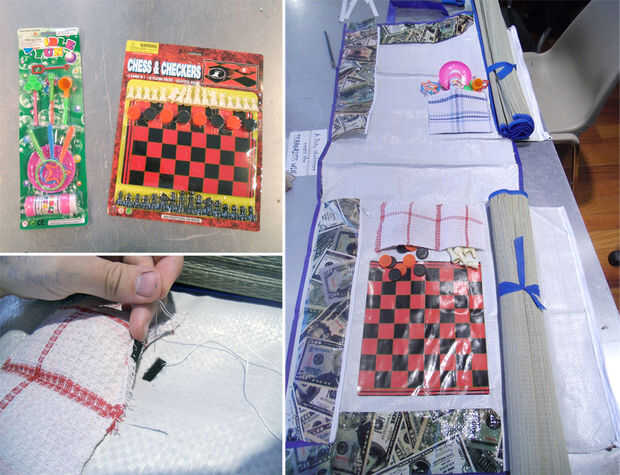 Los bolsillos fueron cosidos en el interior de la bolsa usando chatarra tela cortar bolsillos cuadrados. Una simple aleta fue cosida encima de cada bolsillo con un pequeño gancho + sujetador del lazo (velcro) para sellar la cavidad durante el transporte. Correas elásticas fueron agregadas para mantener las burbujas y revistas.
