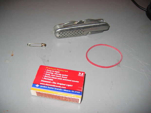 Todo lo que necesitas es una pequeña caja de fósforos, un safteypin, una goma y un cuchillo de la pluma.
