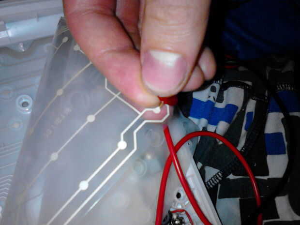 Tomar su UTP / USB cable y cortar por la mitad, tira de los cables y conectarlos a las chinchetas. Puede pegar los cables en su lugar o agregar enchufes al lado del teclado.