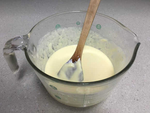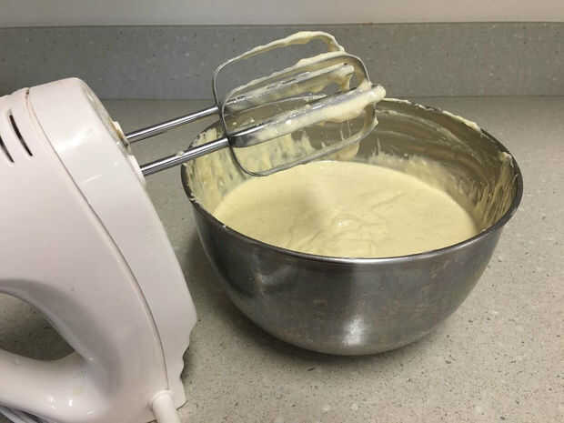 A esto se añade la mezcla de pastel blanco y encender el mezclador de baja, de la mezcla durante 3 minutos hasta que estén bien mezclados.