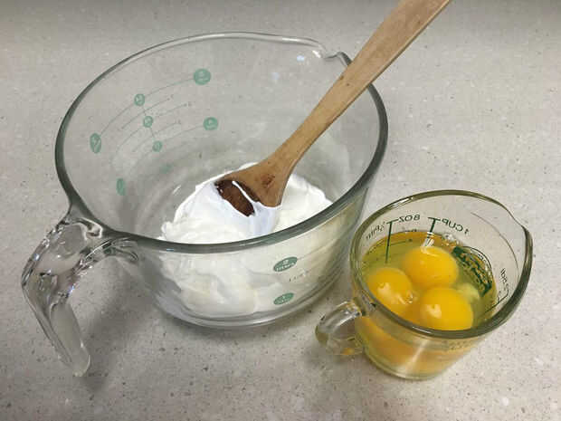 En un tazón grande agregar 4 huevos, 1 cucharadita de almendra o de extracto de vainilla, 1-1/2 taza crema agria y 1/2 palo mantequilla, ablandada. Mezclar bien.