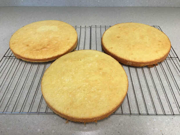 Saque el pastel del horno y dejar para enfriar en los moldes durante 5-10 minutos. Coger un cuchillo y afloje los bordes, girar enfriamiento racks, top redondeado para arriba y abajo, si solo voltea los recipientes y dejar que las tortas de caen de los estantes, ya que fresco, las partes inferiores de los pasteles empezará a romper porque la parte superior de las tortas es ligeramente redondeada. Deje que el pastel se enfríe completamente para al menos 1 hora.