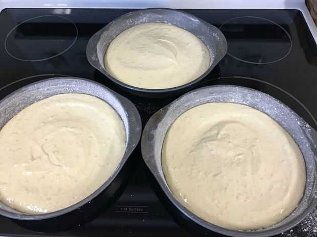 Vierta uniformemente en los moldes de pastel redondo de 3-8" o 2-9" alrededor de moldes.