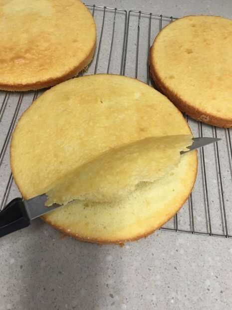 Usando un cuchillo de sierra grande y se mantiene plana contra la parte superior de la torta, nivel muy lentamente la parte superior de las tortas.