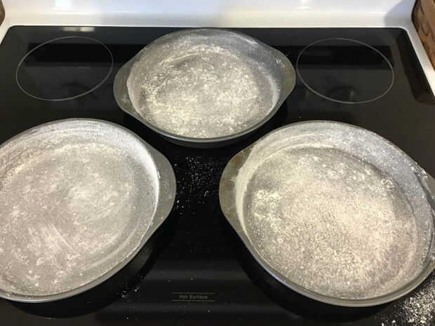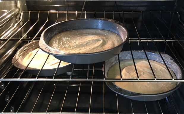 Las sartenes de 8" Hornéen durante 30 minutos, 9" cacerolas durante 35 minutos, hasta que la torta comienza a tirar de los lados de la cacerola.