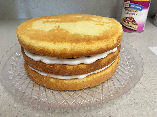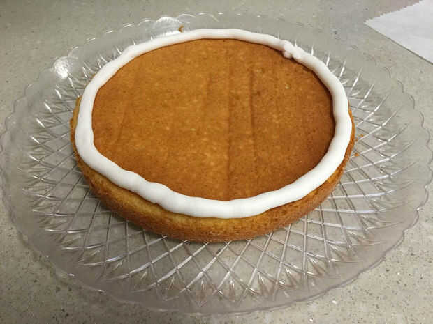 Hacer una presa de helar alrededor del borde de la torta, con la punta redonda grande. Esto mantendrá el relleno.