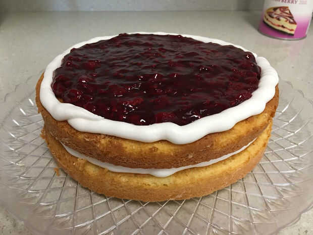 Hacer otra presa de helar alrededor borde exterior. Vierta el resto del relleno de frambuesa sobre la torta.