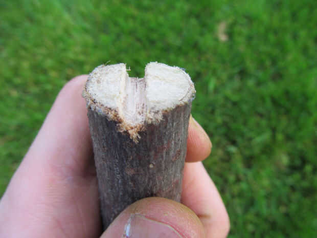 -Tallar una ranura en uno de los gruesos palos que es aproximadamente 1/4" de ancho y 3/16" profundidad.