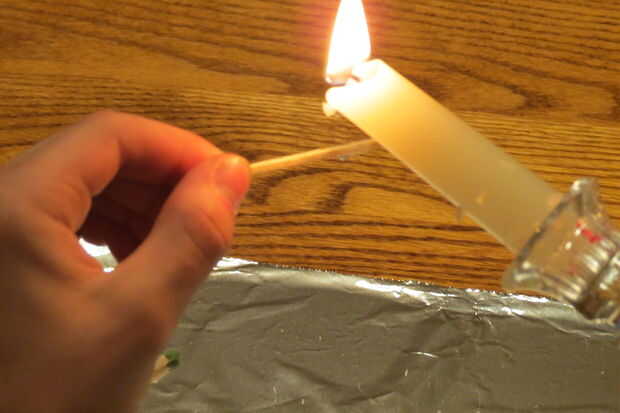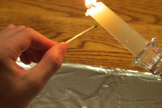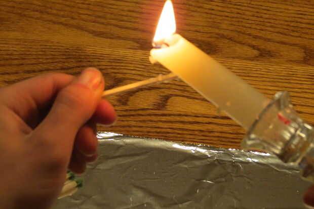 Encender la vela y déjela arder durante un par de minutos. He utilizado una vela delgada para simplemente poder voltearlo y gotear la cera hacia fuera. Tomar su partido y goteo cera sobre la madera de la derecha detrás de la cabeza hasta que se trata de una media pulgada hacia atrás. Tratar de no conseguir demasiado en la cabeza o puede llegar a ser muy difícil a la luz. Gire al partido como la cera se enfría para obtener una capa uniforme.