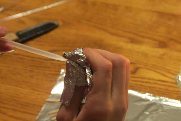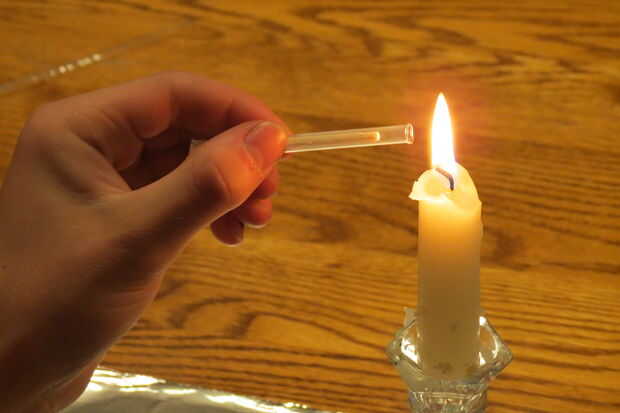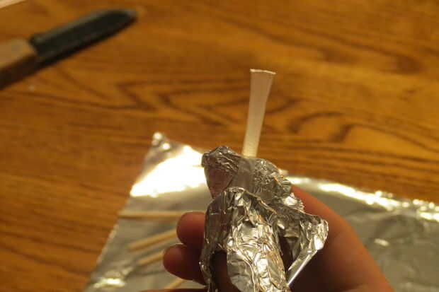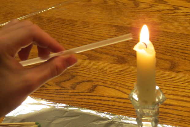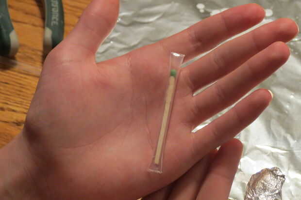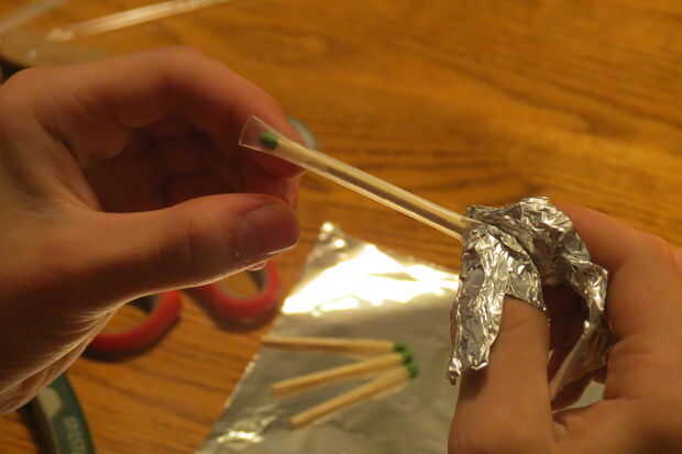 Ahora corte una pajita de plástico por lo que es ligeramente más largo que el partido en ambos extremos. Me pareció que la manera más fácil de sellar la paja cubrir el dedo pulgar y el dedo índice con papel de aluminio para proteger de quemaduras. Calentar el extremo encima de la vela y justo antes de que comience a grabar, pellizque los lados juntos firmemente y manténgalo presionado hasta que se enfríe (aproximadamente 15 segundos). Luego inserte al partido así que la cabeza está cerca del extremo sellado. Eso es muy importante porque el partido puede prenderse fuego cuando usted está tratando de sellar la paja. Sellar el otro extremo y listo!