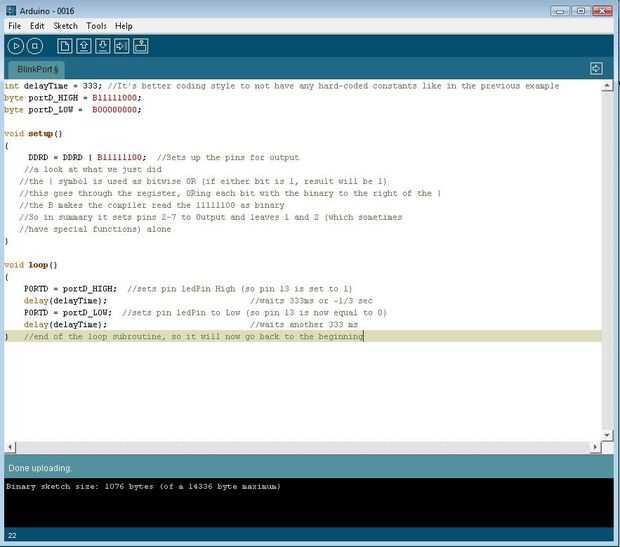 PORTD = portD_HIGH; Juegos pin ledPin alta (por lo que el pin 13 se establece en 1)