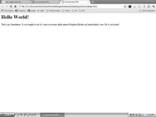< H1 > y < / h1 > etiquetas hacen la fuente en su interior más grande, hacer un titular o en la página de título (por lo tanto, la 'h'). < p > y < /p > son los párrafos. Mueve la fuente en su interior por un espacio o dos. Después de guardar el archivo .html, seguir adelante y pegue en su navegador (vista como una página web) y verás lo que quiero decir con todo esto. Si no sabes cómo hacer los dos primeros, haga clic derecho y seleccione 'Abrir con...' y seleccione su navegador de internet.
