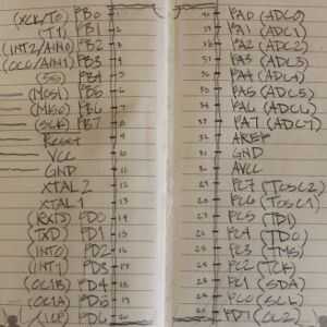 En el lado izquierdo del chip, mirar forma la parte superior y el triángulo pequeño es en la parte superior izquierda, hay 20 pines (este es un microcontrolador de 40 pines). El primero a partir de la parte superior izquierda es las patillas de PB0-7. Es un total de 8 pines como el índice de estos pines y todo en el programa inicia con un índice de 0. Este conjunto de pernos se llaman "Puerto B" y hay 3 otros puertos etiquetados de la A la D. Estos puertos puede configurarse para recibir información y se llama entrada y pueden configurarse para enviar voltaje en alguna forma llamado salida. Pines de poder general para recibir la energía para el chip llaman VCC y GND. Todos sino un pin del puerto D (PD0-6) también se encuentra en el lado izquierdo (parte inferior). PD7 (Pin 7 del puerto D) es solo a partir del lado derecho del microcontrolador.
