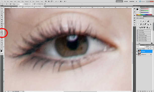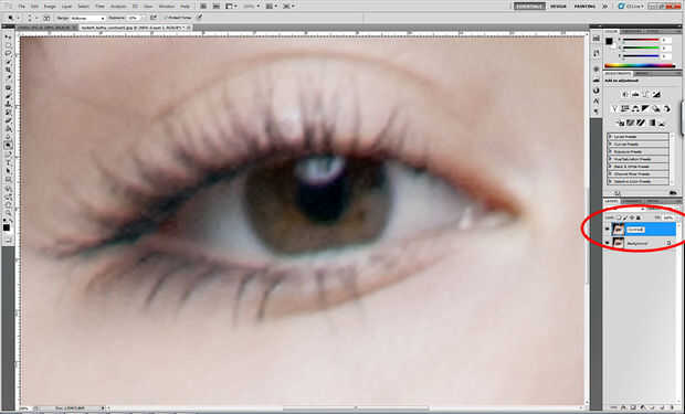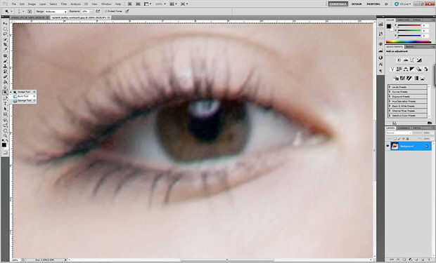 quisiera empezar añadiendo contraste para el ojo entero. Hacer una nueva capa, (esto le permite trabajar sobre la capa en lugar de la original de la imagen así que si usted necesita volver atrás y cambiar algo, puede hacerlo sin tener que empezar) y el dodge y burn herramientas de la paleta de herramienta para oscurecer las pestañas y aligerar los blancos y toques de luz en el ojo. Funciona mejor si tienes tu dodge y burn settings (en la parte superior de la barra de herramientas), en medios tonos en 10-15% opacidad.