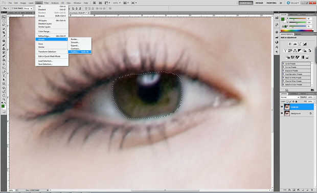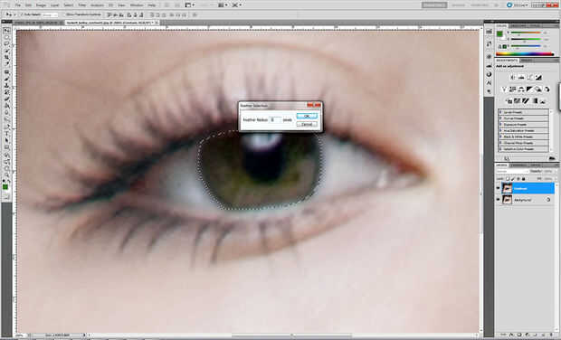 Ahora que ya tenemos un ojo pintado muy bien, aunque un poco desordenado, (lo arreglaremos eso más adelante), podemos centrarnos en agregar algunos más contraste.  Para ello, necesitamos nuestra selección original de plumas.  Vaya a seleccionar > Modificar > plumas y plumas de la selección a unos 3-5 píxeles.  Esto desvanece el borde externo de nuestra selección para que no se ve como una línea nítida cuando añadimos contraste.