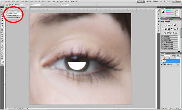 Ahora que tenemos nuestro medio círculo, podemos plasmarla en una media luna. En la herramienta recuadro, seleccione la marquesina elíptica y un óvalo que corta parcialmente en el círculo medio y reunidos en las esquinas. Desea que esto sea un poco profundo, pero si desea hacer menos profundas para hacer una media luna más gruesa, se puede hacer el óvalo un poco menos redonda.