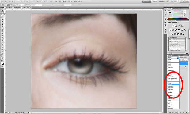 En la paleta capas, seleccione el modo de mezcla "Luz suave". Esto debe mezclar lo más destacado en el ojo más, y desde allí puede cambiar la opacidad de la capa a tu look deseado.