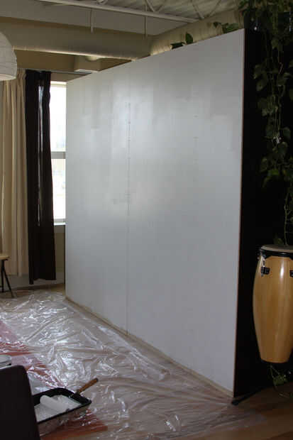 Nos imprimar con imprimación de Kilz. Lo único que deberíamos haber hecho es grabado primero las juntas con cinta de enmascarar y luego pintado. Entonces la pared hubiera sido perfecta. El papel mojado le gusta tener en la más pequeña grieta y burbuja.