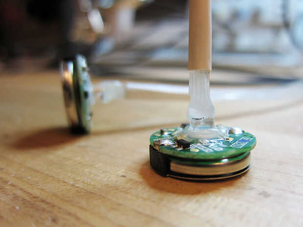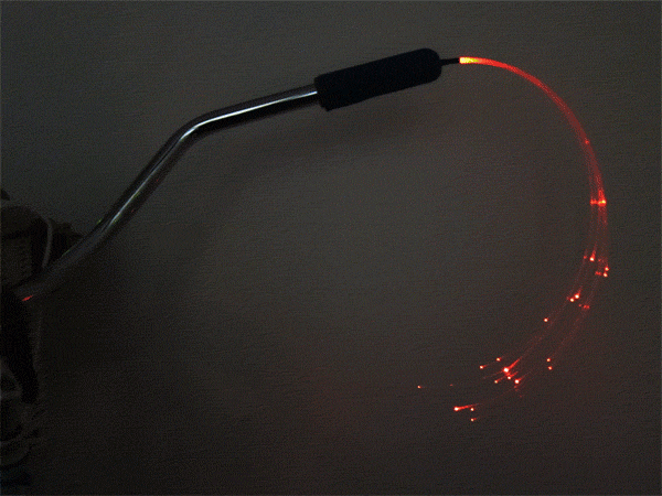 Una idea divertida pero fallada. Tenía algunos viejos componentes de una luz de bicicleta spokelit que constan de un color cambiante llevó en un tablero circular, con una pila de monedas por debajo. Había estado buscando una forma de reutilizarlos cuando me di cuenta que son del tamaño perfecto para el final de mi manillar. Con algunos recortes sobrantes de mi vestido de fibra óptica había hecho algunos paquetes con epoxi y luego ajustaron todo directamente a los led. Mientras pensaba que el punto débil sería el paquete sí mismo (descamación fibras) o la conexión para el LED, he aprendido que el punto más débil era en realidad la conexión entre el led y la Junta. Lamentablemente ambos rompieron en la base después de algunas luz uso. Lamentable, pero un aprendizaje agradable que el epoxi es lo suficientemente fuerte para sujetar la fibra ópticos filamentos juntos firmemente. Con algún apoyo adicional para el led sí mismo éstos habría sido grandioso.