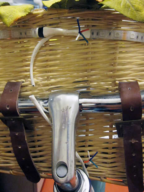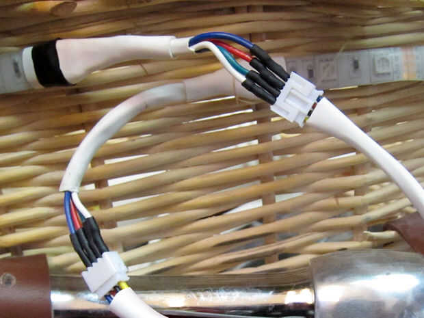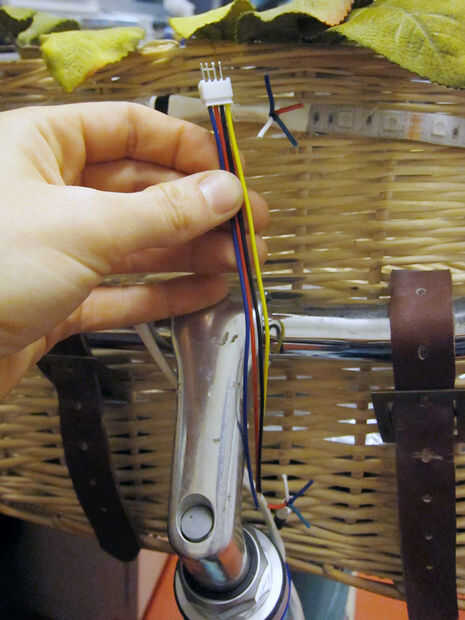 Había asegurado de la sección de LEDs alrededor de la cesta y había cortado los paquetes de alambre unas pocas pulgadas de la tira en cualquier lado. Con la cesta en su lugar en mi bici, pude con precisión calibre cuánto tiempo para hacer nuevas conexiones. Porque el lizete tenía diferentes colores entonces el 4 que estaba utilizando, me aseguré de extra fui conectando como con como y que ambos conectores se orientaron a la misma manera en relación con los cuatro colores, para evitar la posibilidad de cortocircuito de la tira.