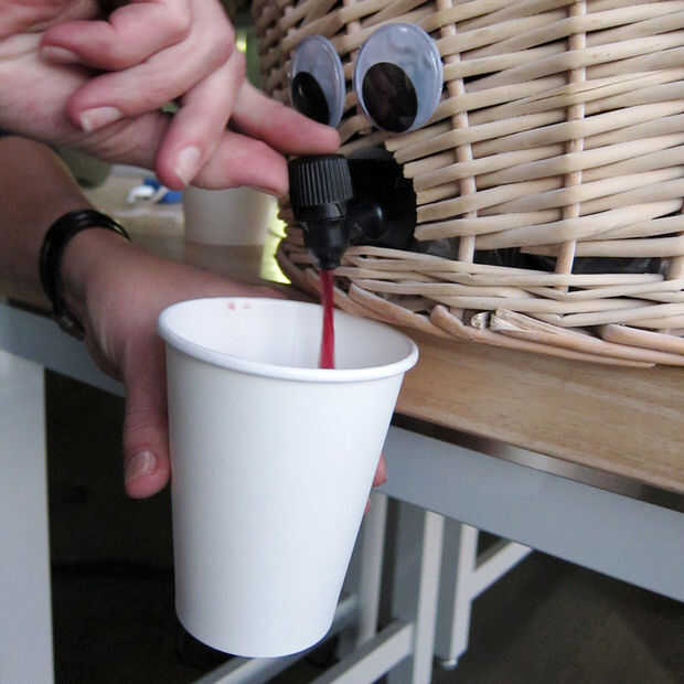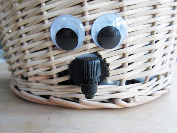 Para integrar esto en mi cesta, primero recortan el mimbre para la boquilla, luego caliente pegado en su lugar las piezas que fueron desalojadas en este proceso (por eso hay una cinta en la tercera foto). Añadir unos ojos googlie como algunos inmediata apelación antropomorfo, y listo servir!