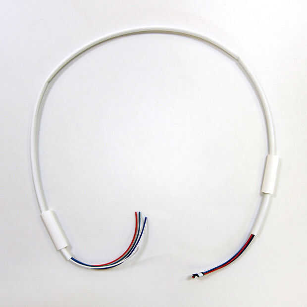 Usando el diagrama que he creado como una guía, hice las secciones de cable para cada uno de los saltos en mi tira de led pasando los 4 cables por 3/16"-encogimiento de calor, con dos 3/8 corto" secciones retráctil para proteger las conexiones ellos mismos en cualquiera de los extremos (primera foto). La tira del LED tiene vías para la alimentación principal y de los canales R, G y B, usé alambre de aquellos colores más blanco para mantener las cosas fácil.