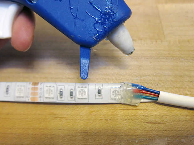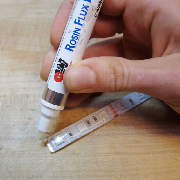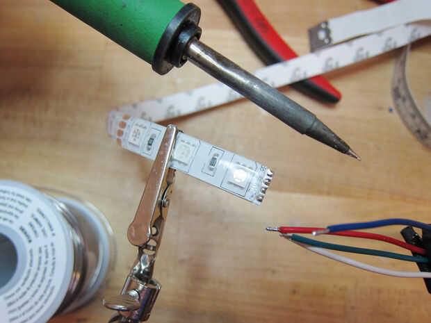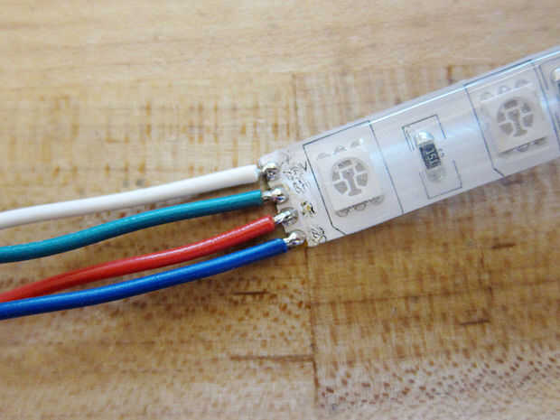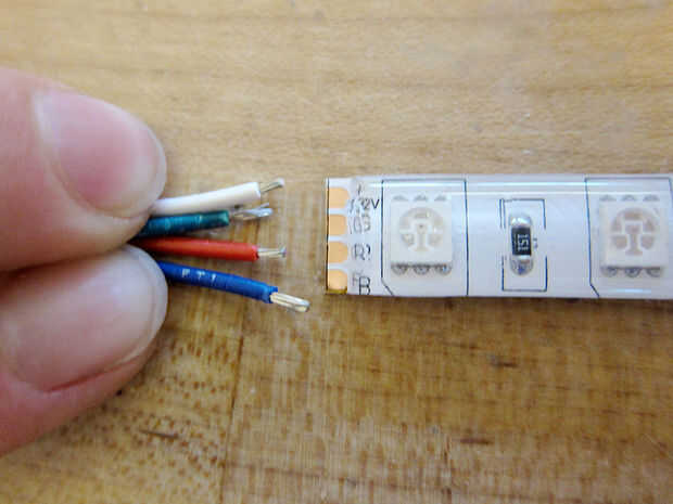 Escorificados los pads de soldaduras y los extremos de hilo expuestos y había estañado con soldadura. Dejando una burbuja agradable de soldadura sobre las almohadillas de la tira LED hecho fijar los cables a ellos más fácil.