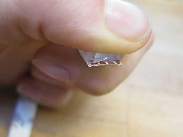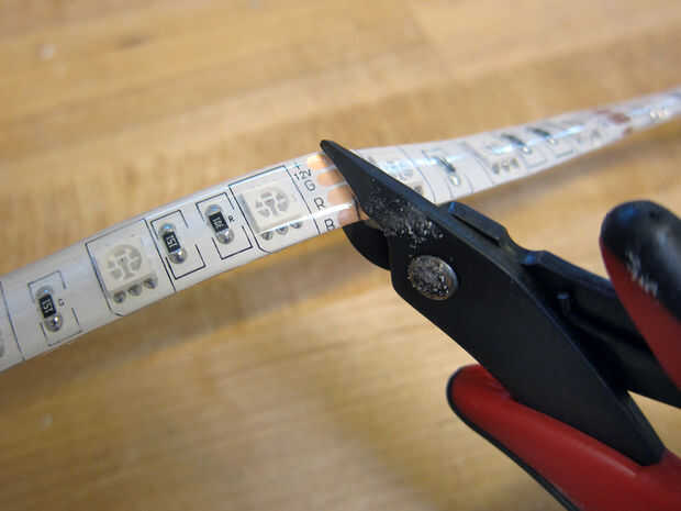 Una vez que éstos fueron preparados hice un corte en la línea de corte más cercana a lo largo de la tira a mi longitud deseada para la primera sección. Esta tira de LED funciona en ambas direcciones, por lo que no importa qué extremo trabajó desde que ambos enchufado en el controlador de IR. Cuidadosamente pelados detrás la impermeabilización y cortado para exponer los electrodos de soldaduras.
