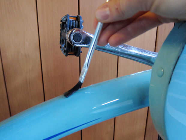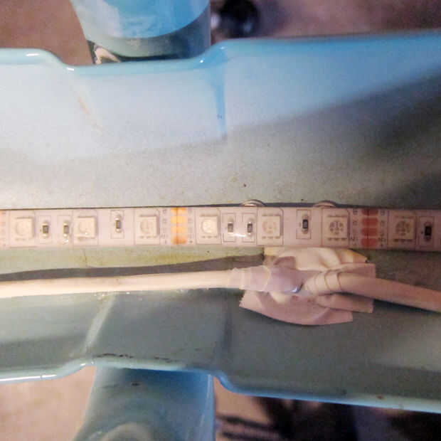 Una vez que ha solucionado el problema encontrado en el último paso, pegué todo hacia abajo usando una mezcla de cemento de contacto para la franja y de epoxy para los paquetes del alambre. La parte más difícil fue pegar la parte inferior del guardabarros delantero. Para hacer que los extremos pone plana utiliza una cantidad generosa de epoxy y los reprimieron. Luego reforzó la sección del cable que pasa a través del agujero para evitar que los cables que cortar por el metal afilado y encolar el resto del paquete de cable.