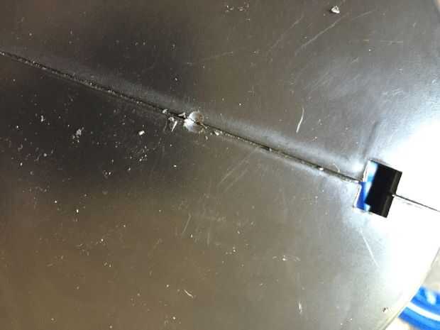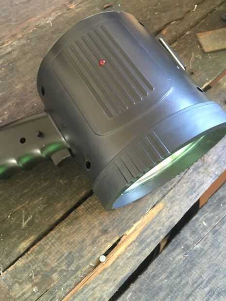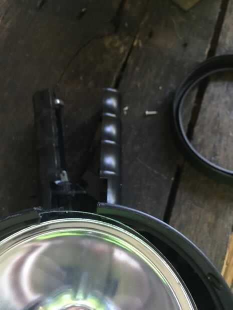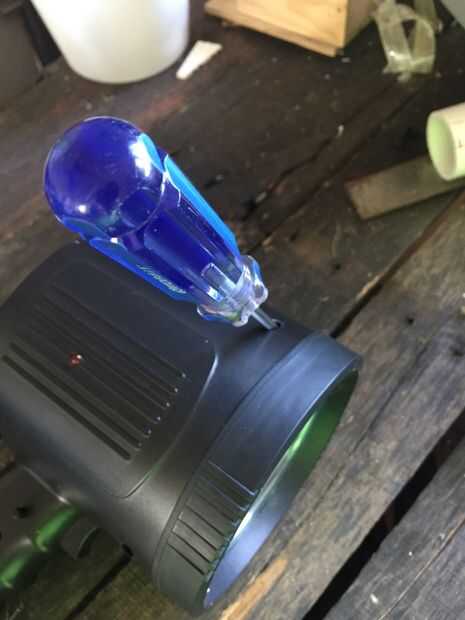 Desmonte la linterna foco y todo el interior hacia fuera. Después eso Corte de la manija con la sierra. A continuación, perfore un agujero en el centro exacto de la parte superior.