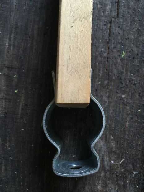 Doblar el soporte del conducto para que el perno pueda ir todo el camino a través al otro lado entonces atornille a la linterna. Después de que perfore un orificio de 1/3 de pulgada de la parte inferior de la estaca y luego fije el soporte del conducto con el perno.