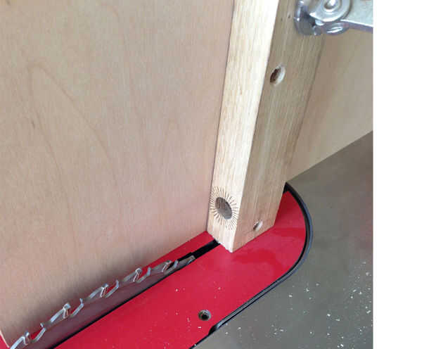 Con su plantilla marcado y perforado, es ahora tiempo para cortar la ranura de la ayuda hasta el final de la plantilla en el agujero del pasador. Esto es necesario para que usted puede poner una pequeña cantidad de tensión en la plantilla con la tensión tornillo y tuerca para agarrar firmemente la clavija en la plantilla. Sujeta la plantilla a una junta para que con seguridad podía empuje la pieza a través de la Sierra de mesa. Para todos los intentos y propósitos, la ranura debe estar centrada en el agujero.