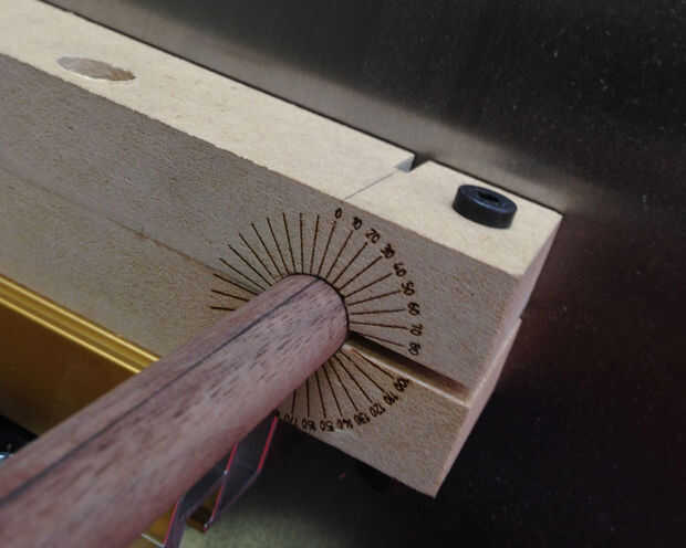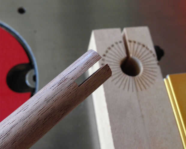 A continuación coloque el pasador en la plantilla y alinee la marca con el borde frontal / 0 grados. Ajustar la hoja de sierra a la profundidad que se desea que la muesca que. Ejecutar la plantilla aunque la sierra y ahí lo tienen, una muesca de corte limpio en una clavija redonda. Si usted necesita el otro extremo de la muesca, luego dé vuelta la espiga alrededor y repita la alineación. Si se hace con cuidado, tus las muescas deben estar alineados justo! Mi 3D impresos nodos queden bastante bien... ¡ estén atentos para más información sobre este proyecto de mayor envergadura.